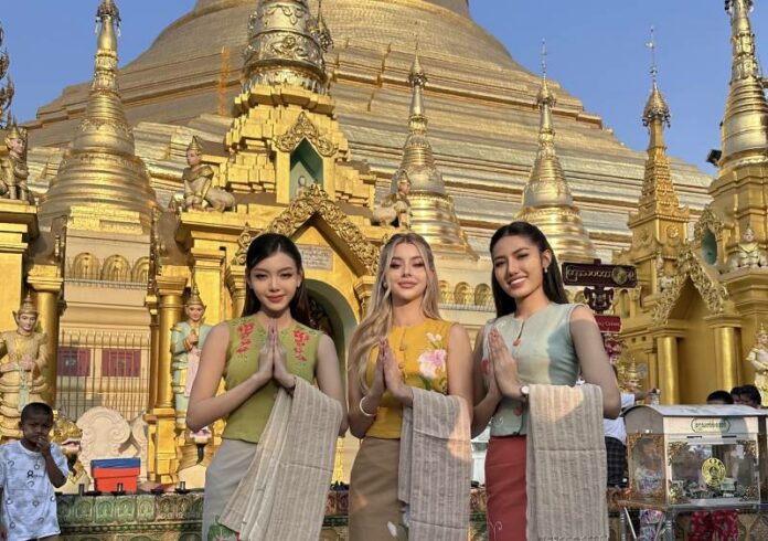 Được xây dựng cách đây hơn 2.500 năm, Shwedagon Pagoda được xem là một trong những thánh địa Phật giáo quan trọng nhất tại Myanmar. Đồng hành cùng cô trong hoạt động đầu tiên tại đây là Thae Su Nyein và Myint Myat Moe. Trong không gian linh thiêng của ngôi chùa nổi tiếng, các người đẹp đã cùng dành những khoảnh khắc lắng đọng để chiêm nghiệm và bày tỏ sự tôn kính trước những giá trị văn hóa – tâm linh sâu sắc của đất nước.